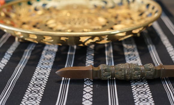博多織は、京都の「西陣織」に並ぶ日本伝統織物の一つで、「献上柄」と呼ばれる代表的な模様が特徴的で、この献上柄の縞のモチーフには家内安全と子孫繁栄の願いを、そして仏具のモチーフには魔除けや厄除けの願いが込められていると言われています。