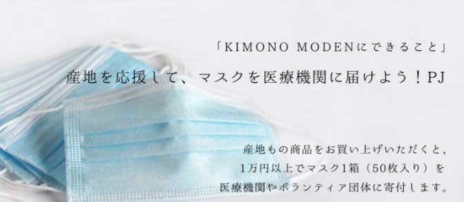 具体的には、KIMONO MODERNで販売されている産地もの商品を1万円以上購入するごとにマスク1箱を医療現場や福祉で働く人たちへお届けするということです。