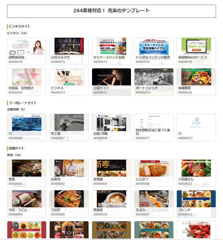 なんと!テンプレート数が約150種類あり、264業種に対応しているんです。