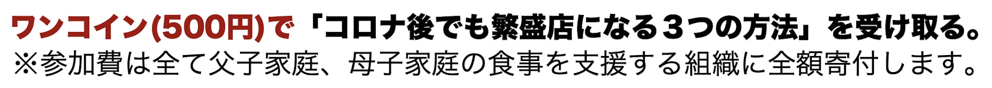 なので、今回は500円で「コロナ後でも繁盛店になる3つの方法(音声)」を提供、さらに売上全額を父子家庭、母子家庭の食事を支援している組織に、全額寄付いたします。