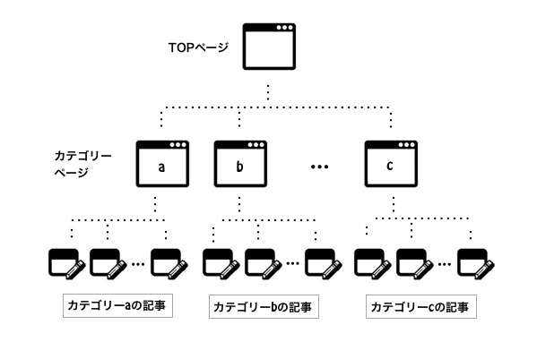 サイトは下図のように3階層の構造を心がけよう。このように、トップページからサイト内の全てのページに2クリック以内で行けるような構造になっているとクロウラーが隅々まで巡回しやすくなる。