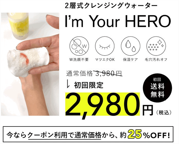 公式オンラインショップから初めてImYourHEROを通販する方向けに単品通常3,980円するところすぐ使えるクーポン使用で初回2,980円になるんです。