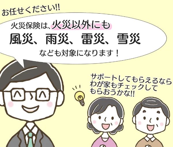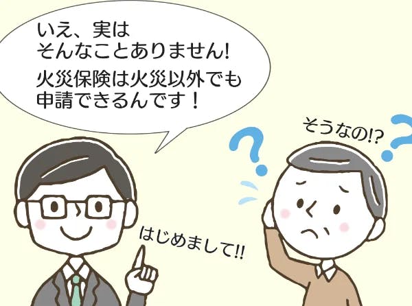 その後詳しく話を聞き、火事だけだと思っていた火災保険が台風や大雨、雷に起因する損害も補填する内容になっていることを知り、とても損したような気持ちになりました。