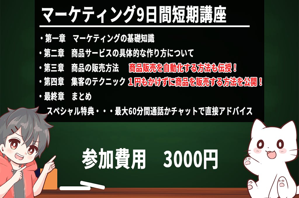9日間かけて5本の動画教材と4本の文章教材を交互に学ぶことによりマーケティングを習得してもらう短期講座となっています