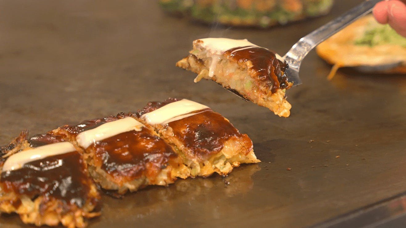 あえてキャベツの芯側の部分を使い、大きめのざく切りにすることでキャベツの甘みを引き出しています。生地の量を極力少なくしてあり、粉物を食べているというよりも、野菜を食べているような感覚に。