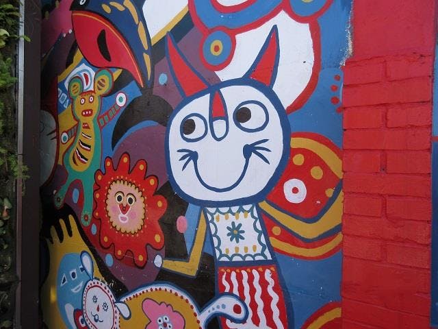 中国で共産党と闘い、敗退した後台湾に渡ってきた軍人たちなどが住んでいた住宅地。家の壁という壁、道路などあらゆる場所にカラフルな絵が描かれた「虹の村」。