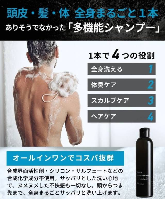 A. ZIGENは髪・頭皮・体を1本で洗える全身対応タイプとして販売されています。ジムや旅行など、荷物を減らしたいシーンで活用している人も多いようです。